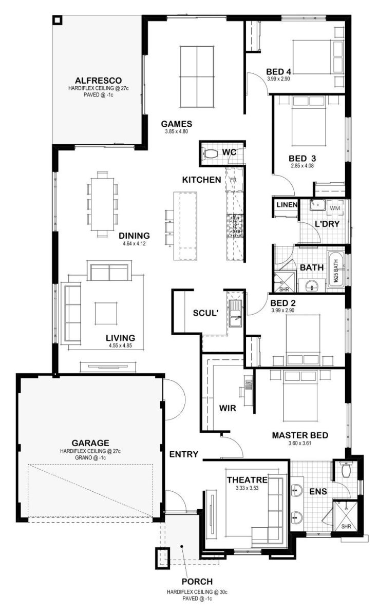 A modern 4 bedroom home centred around a functional kitchen, activity zone and spacious alfresco.