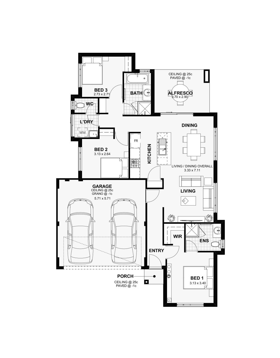 The Frankland is a family-focused three-bedroom layout that separates spaces for comfort and privacy, with the master suite at the front and the secondary bedrooms positioned toward the rear.